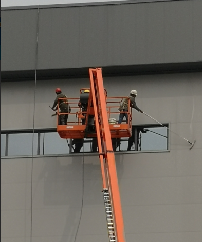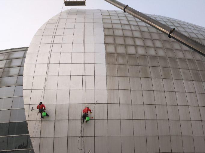 (1) 操作人员坐于吊板规定位置,将所有用具连在吊板上口侧身下;(2) 缓缓将吊板下放,到达起初工作位置;(3) 用水枪对准工作位置喷水,初步除去尘灰,然后将清洁剂涂在玻璃或墙上,稍后用外墙刷擦拭,最后用清水将污水冲洗干净。(4) 一个位置工作结束,缓缓调整至下一个位置继续清洁直该纵向位置至工作结束,然后再横向移动位置;(5) 整个工作过程中,安全监督应自始至终作现场安全监督,不得擅离职守; (6) 清洗玻璃幕墙严禁使用碱性清洁剂,否则会造成幕墙镀膜在半月左右斑脱、褪色等严重后果。
