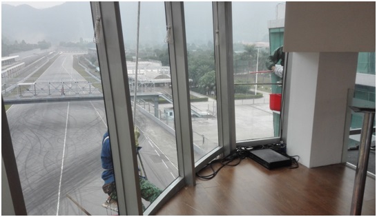 玻璃幕墙:裙楼部分的准备方法同清洗马赛克外墙,采用的清洁剂、清洁工具为玻璃水、洗洁精、百洁巾、玻璃刮刀等。高处作业采用吊船清洁,先把自由伸缩的挂臂固定在天台的女儿墙上,在挂臂的另一端放上平衡铁,平衡铁的重量应超过于人、吊篮及清洁工具重量的总和。放下牵引钢丝绳套上吊篮,开启开关提升到顶部,工作人员带上清洁用品上吊篮内开始操作,进入吊篮应保持吊篮平衡,从上往下有序地清洁。玻璃幕墙每年全面清洁一次,局部污染,即时发现即时清理,以免日久难以处理干净。在操作吊篮时一定按照操作规程运作,以免发生意外,使用玻璃刮时应注意避免金属部分刮花玻璃表面。复合铝板:准备方法同清洗玻璃幕墙,清洁工具为起渍水、百洁布、玻璃刮刀等。清洗方法:用百洁布浸起渍水在复合铝板表面上清洗,然后用水冲洗干净;如有局部严重污染或有污垢,应加重清洁剂的浓度重点擦洗。复合铝板表面清洗每年全面清洁一次,如发现局部污染,即时清洁。使用玻璃刮时应注意避免金属部分刮花玻璃表面。
